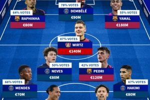 球迷票选欧冠最佳阵:登贝莱、亚马尔、维尔茨在列,主帅恩里克