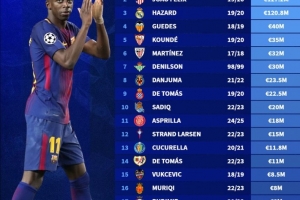 1.登贝莱(巴萨)17/18赛季 1.35亿欧